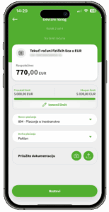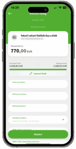Prilikom odabira opcije Plaćanje i Prenesi sada vam je vidljiv iznos mesečnog limita kao i preostalog limita za plaćanje.